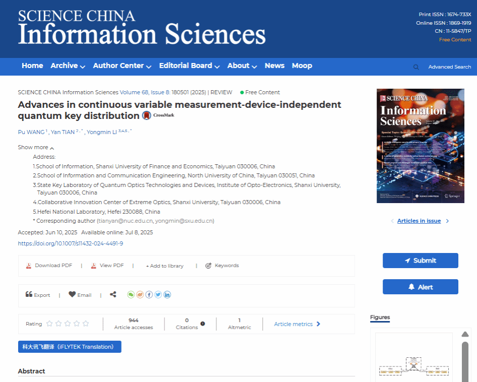 近期,学院青年教师王普博士的研究成果“Advances in continuous variable measurement-device-independent quantum key distribution”在《中国科学:信息科学》2025年第8期(Science China Information Sciences, 2025, 68(8), 180501)上发表,该期刊系我校认定的AI级学术刊物。无码破解