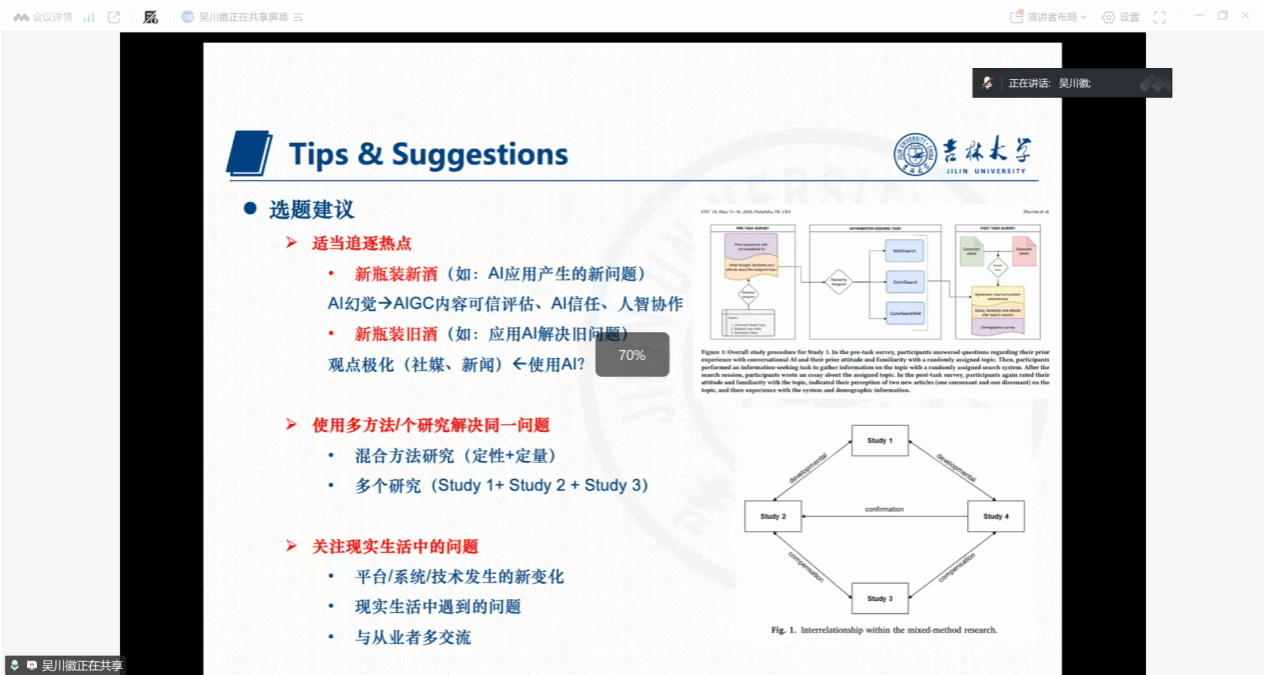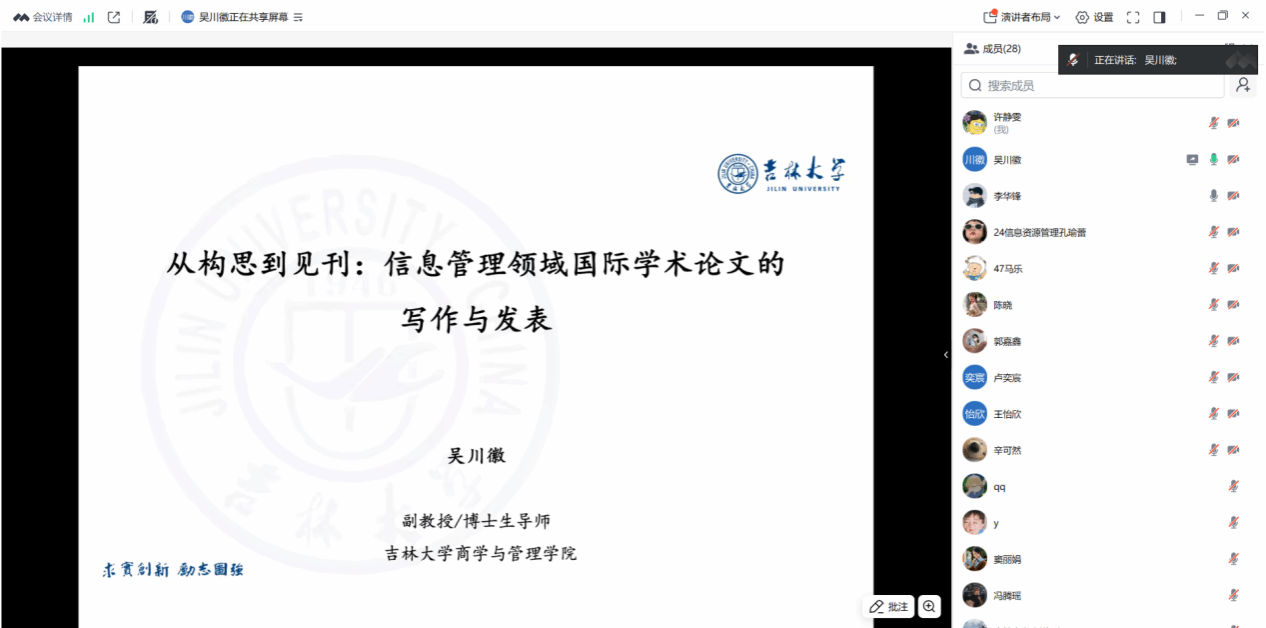 “信息资源管理一级学科·一流学者100分钟系列讲坛”第25期于2025年12月10日晚通过腾讯会议平台顺利举办。本期讲座特邀吉林大学商学与管理学院副教授、博士生导师吴川徽博士担任主讲嘉宾,由无码破解